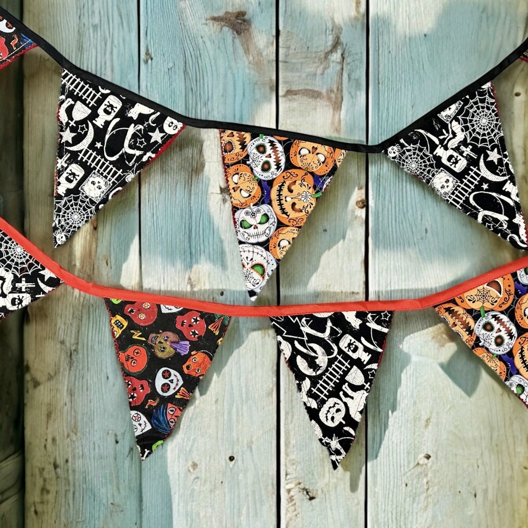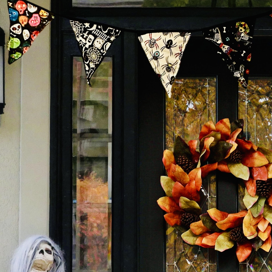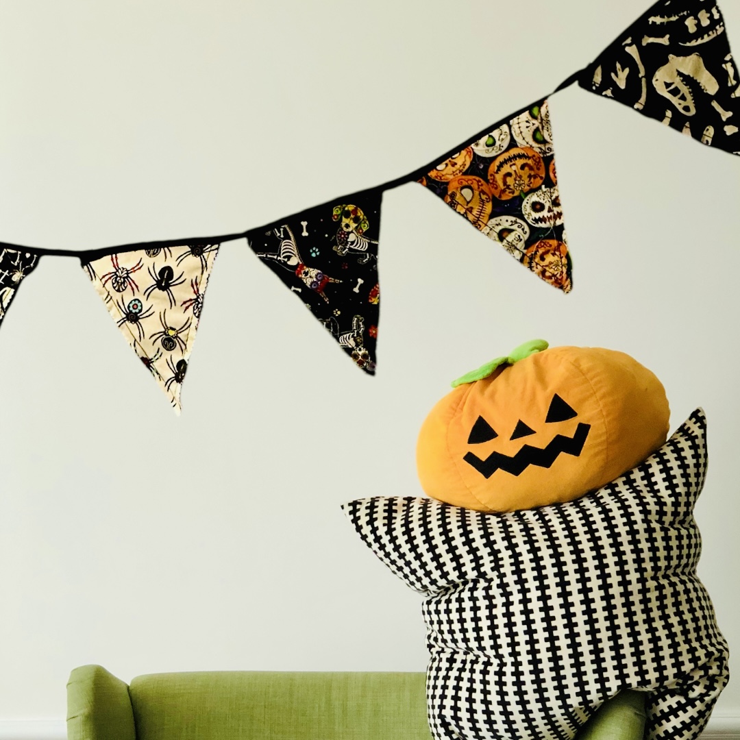 Este Halloween, dale un toque especial a tu hogar con nuestros banderines de tela, hechos a mano usando retazos de nuestras telas. Cada banderín tiene 6 banderas llenas de color y detalle, y algunas de ellas brillan en la oscuridad. Son ideales para decorar de forma original y reutilizable, mientras apoyas la reducción de desperdicio textil.